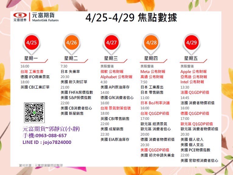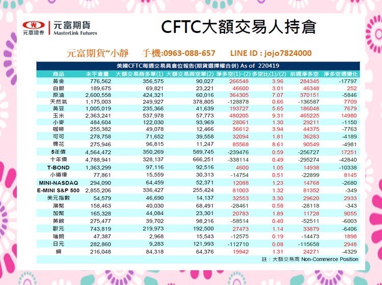【海期訊息】4月25日~4月29日國際金融焦點數據&CFTC大額交易人持倉)@元富期貨開戶推薦郭靜宜(小靜)@LINE : jojo7824000@期貨全台開戶@期貨線上開戶