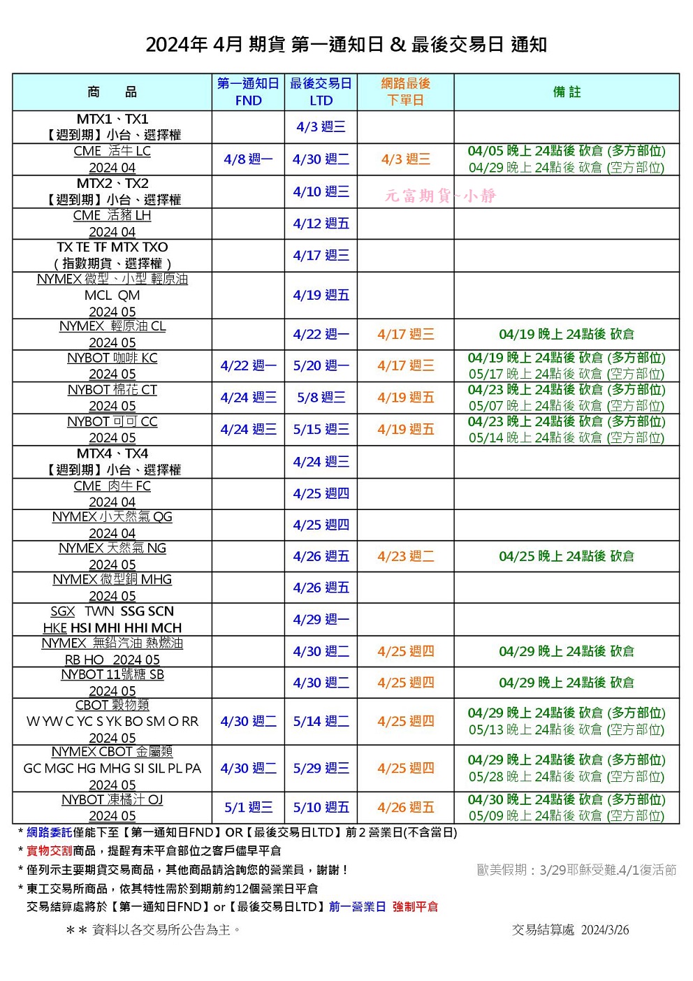 2024年4月 期貨 第一通知日&最後交易日 通知