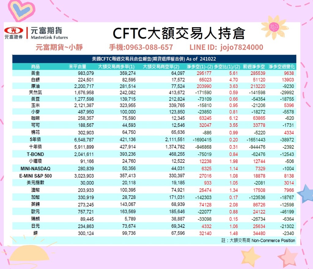 元富期貨-海期專業【10月28日~11月1日海期焦點數據&CFTC大額交易人持倉】#微台指#微小那#微小道#微黃金#微型輕原油#微型銅#微日經