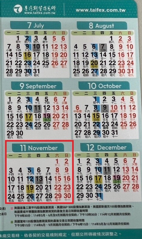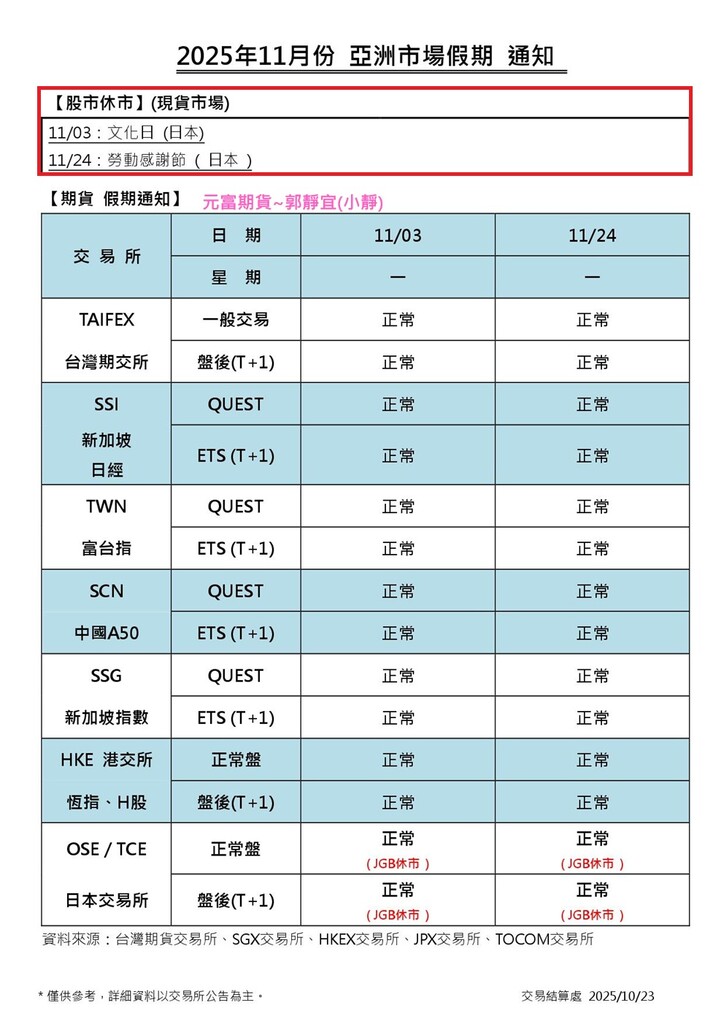 元富期貨小靜【2025年11月份海期亞洲市場假期//11月台灣期貨市場結算日】#元富期貨推薦開戶營業員郭靜宜#海期手續費#大台手續費#小台手續費#選擇權手續費下單 #手機閃電停損單